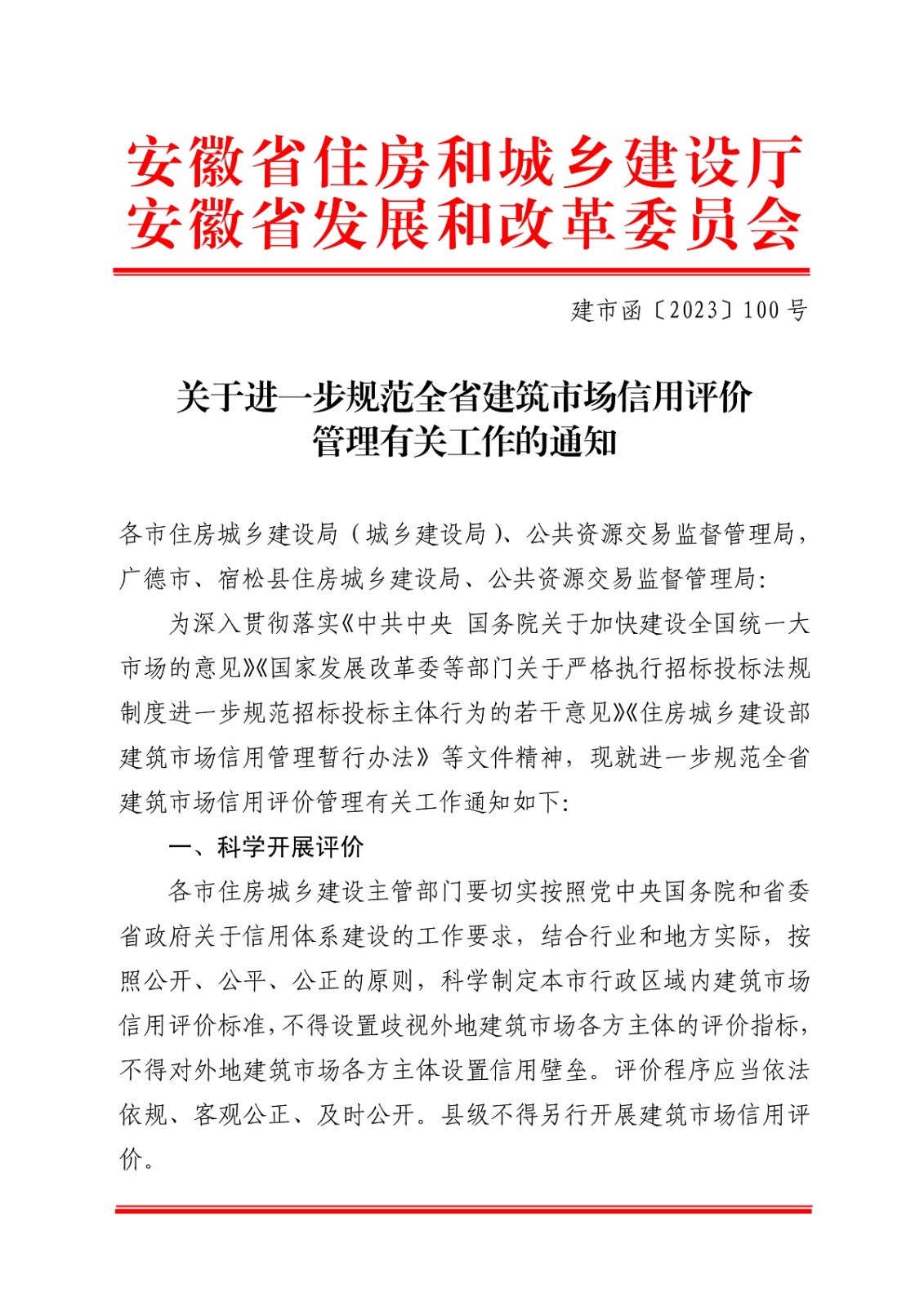 关于进一步规范全省建筑市场信用评价管理有关工作的通知(建市函〔2023〕100号)