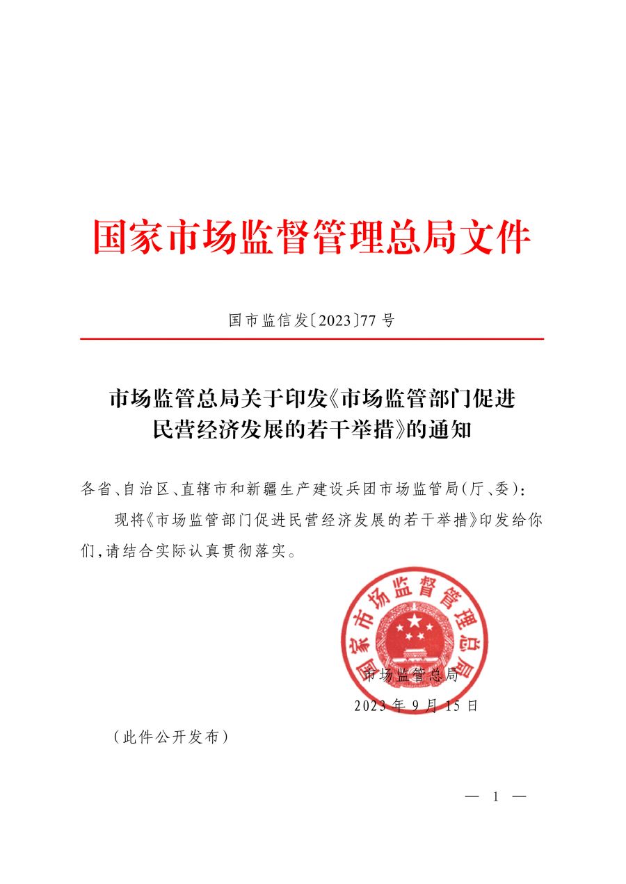 市监总局:关于印发《市场监管部门促进民营经济发展的若干举措的通知》国市监信发〔2023〕77 号