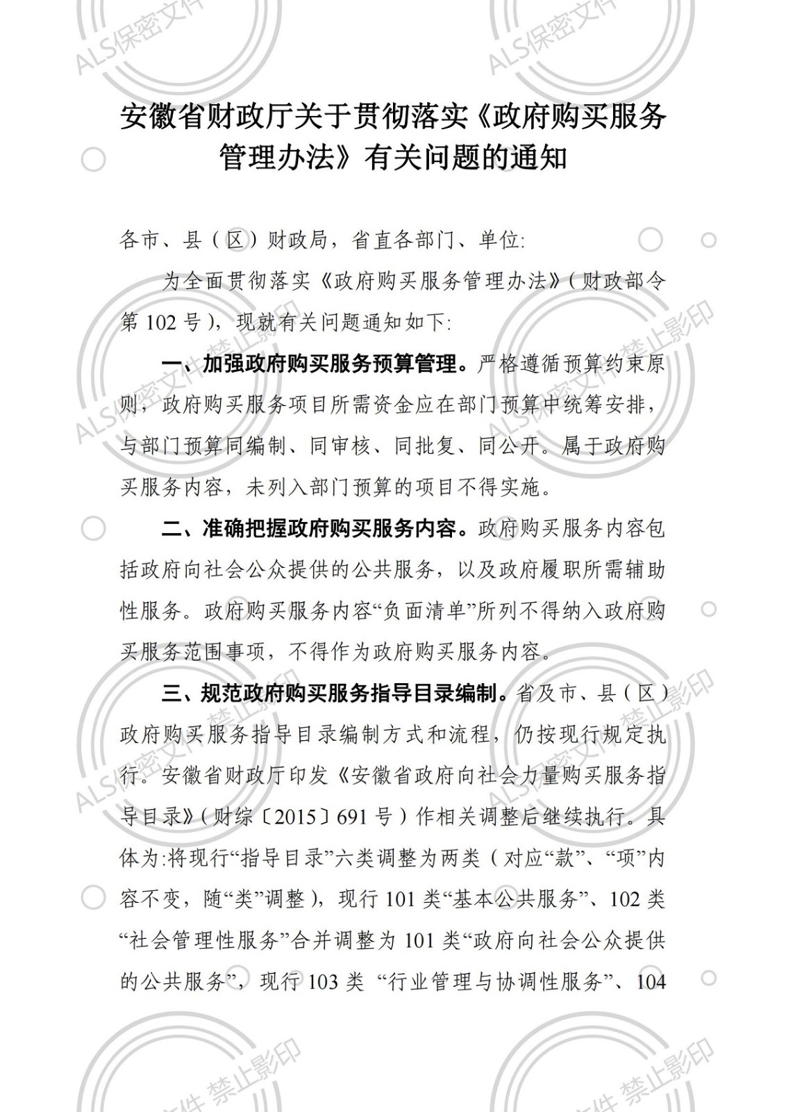 皖财政厅《关于贯彻落实《政府购买服务管理办法》有关问题的通知》 财综〔2020〕105 号