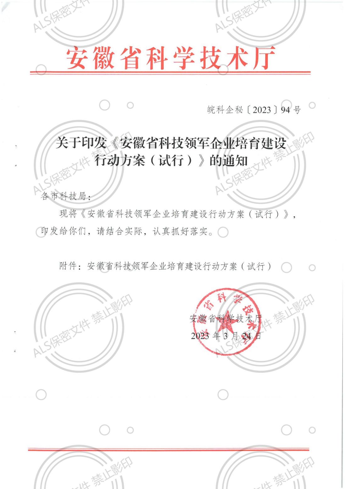 皖科技厅《关于印发《安徽省科技领军企业培育建设行动方案(试行)》的通知》皖科企秘〔2023〕94号